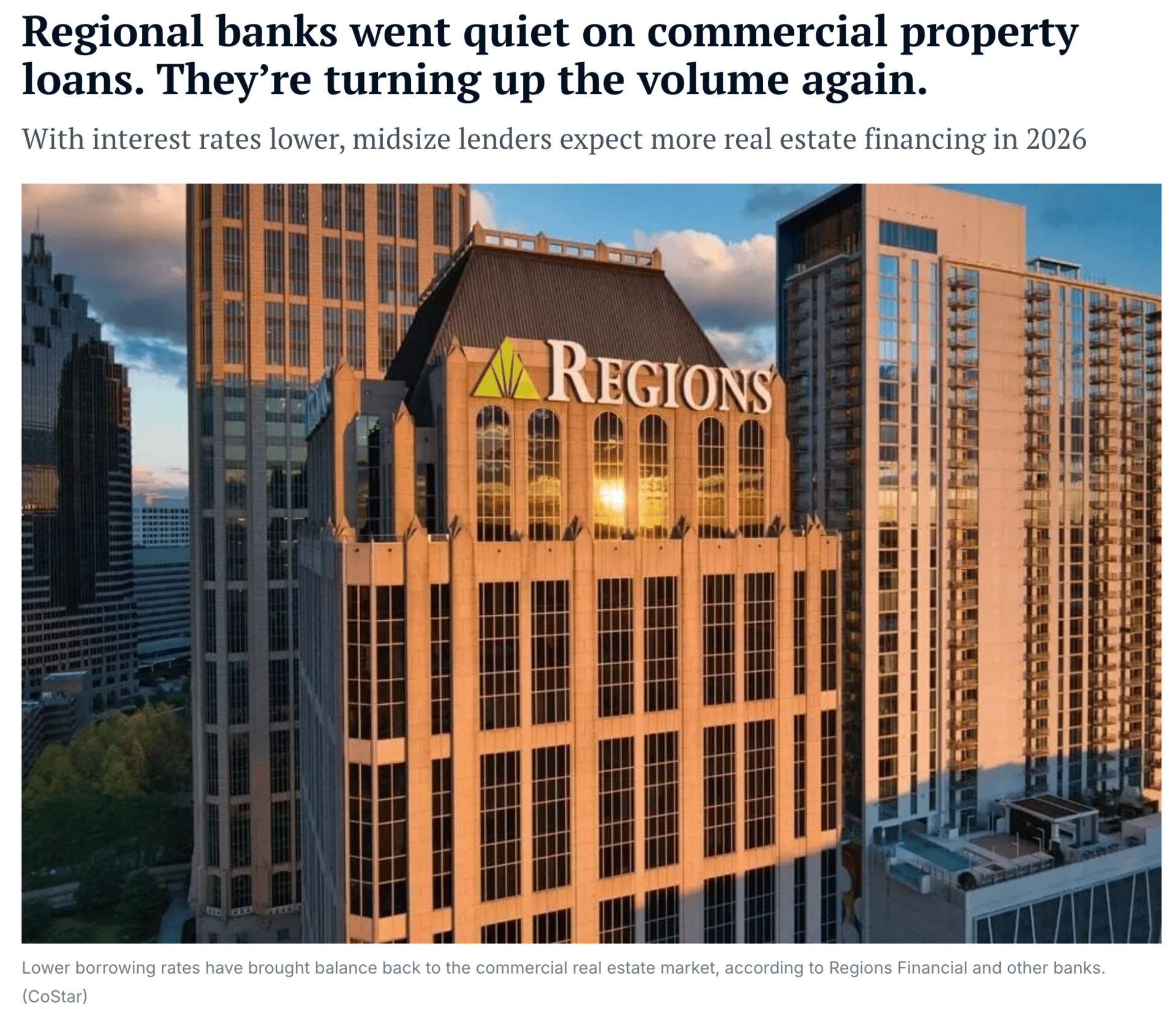Regions said elevated capital markets refinancing activity during 2025 constrained loan growth, but this headwind has largely passed.