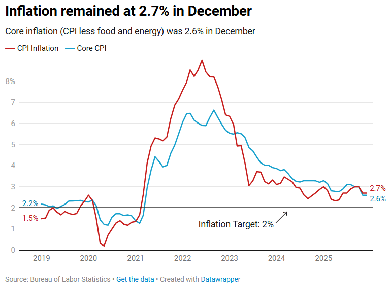 US inflation continues to come in lower than expected: 2.7% in December and Core Inflation (which doesn’t include food or energy costs) was 2.6% in December.
