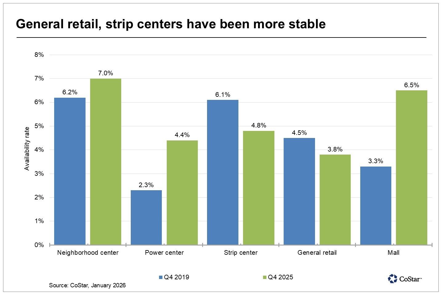 Availability has loosened the most for midsize boxes in malls, neighborhood centers and power centers. Macy's, Joann, Kohls, Rite Aid and Party City were among the brands closed in 2025 from Chula Vista and Central San Diego to Vista and Escondido. Availability in each of these subtypes rose more than a full percentage point year over year in 2025, exceeding their 2019 year-end levels.