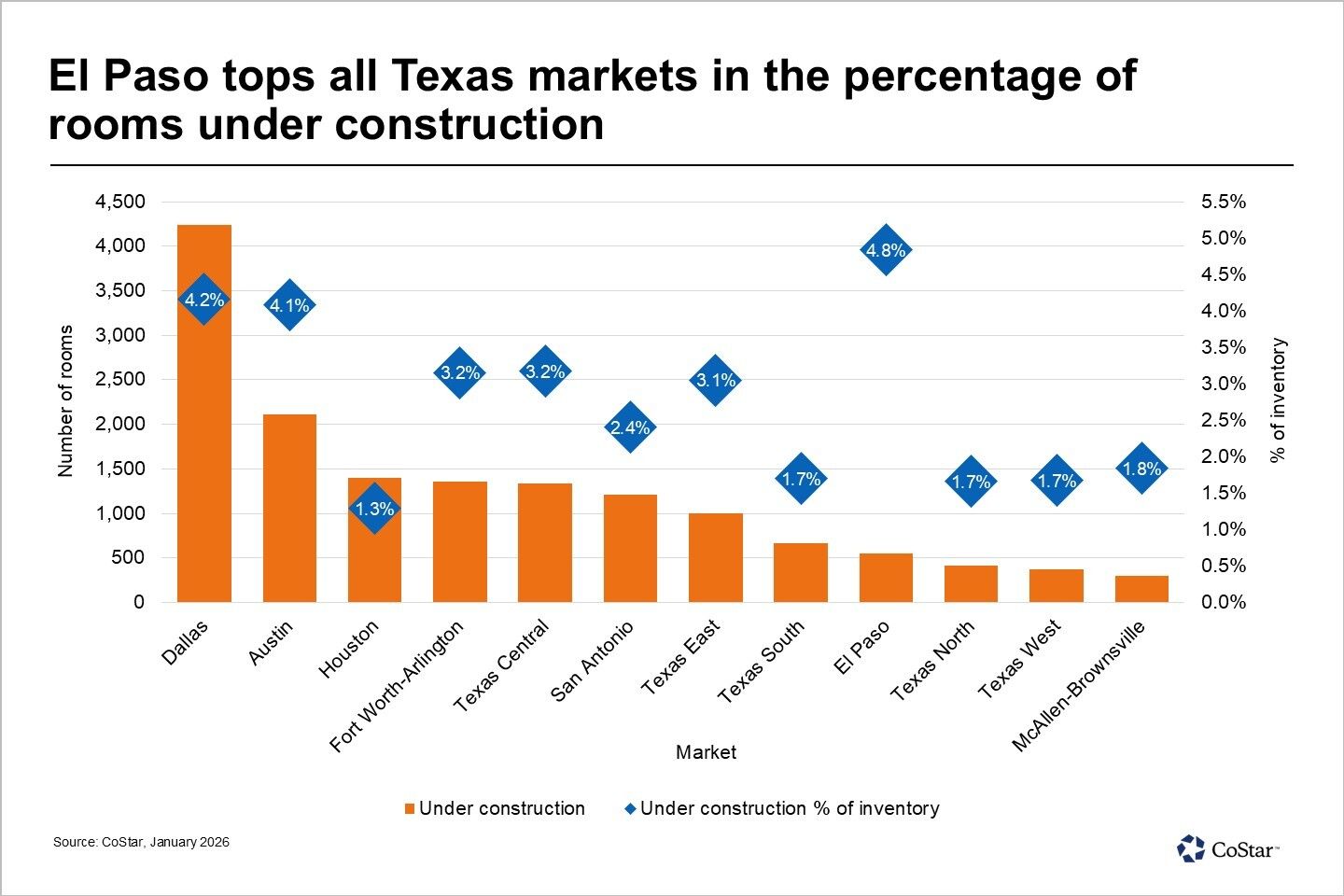 Texas has nearly 15,000 rooms under construction across its major metropolitan areas and regional markets, with development most concentrated in Dallas, Austin and Houston.