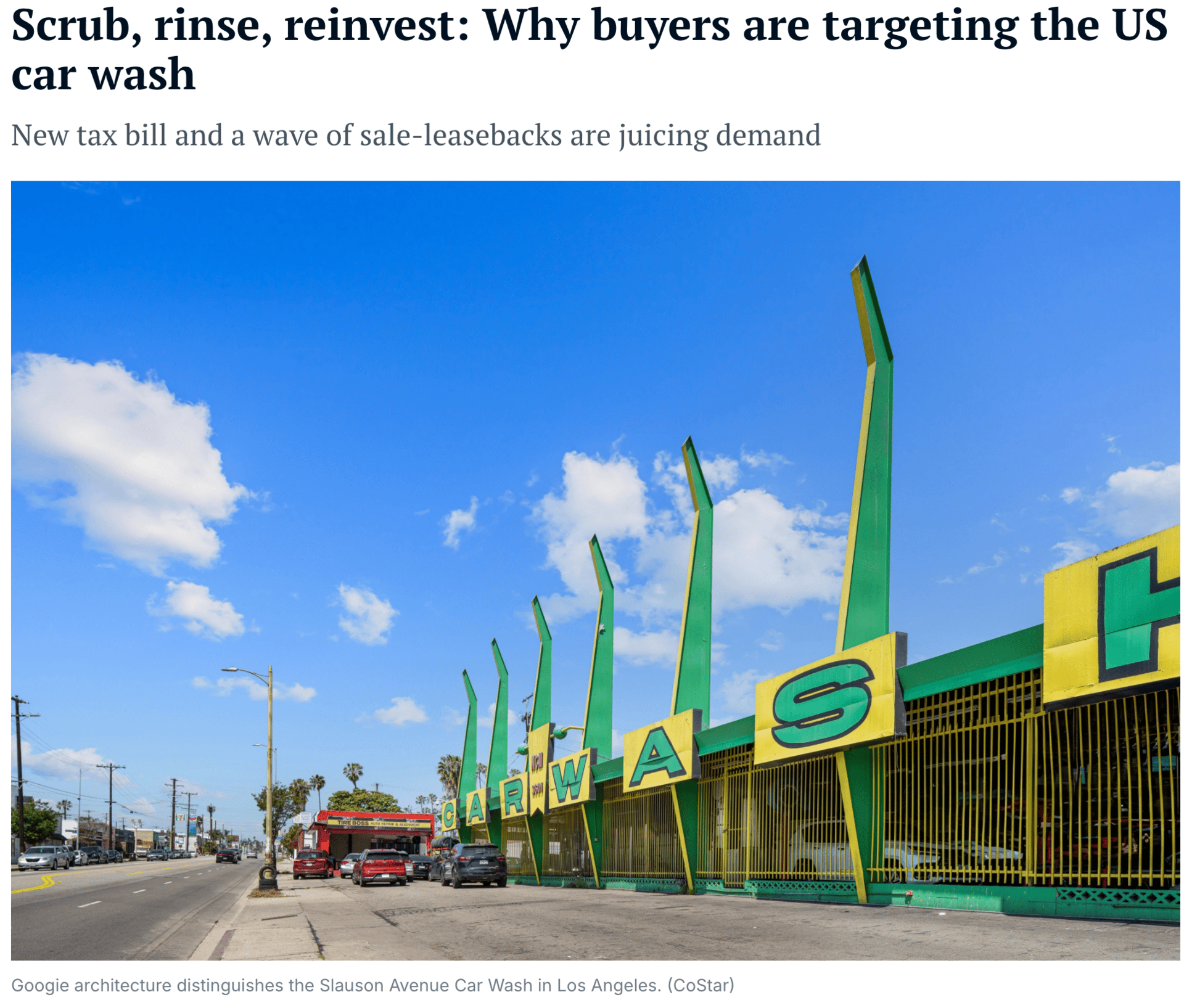 Across the nation, sales of car wash properties soared in the past year as operators cashed out of their owned real estate in sale-leaseback deals to fund their next wave of growth. Legislation adopted as part of the federal One Big Beautiful Bill last year boosts tax incentives for buyers of properties with qualifying equipment, such as car washes. That's expected to help send the sector to record transaction volume this year, property professionals say.