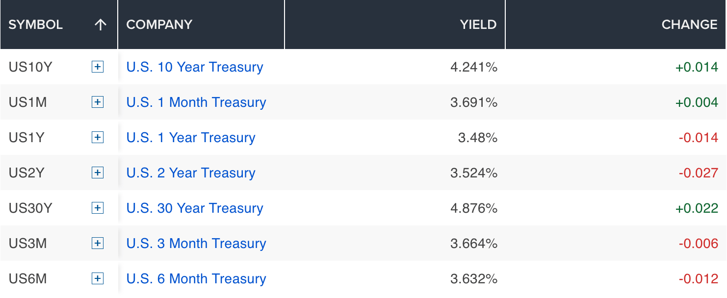 The 10-year Treasury yield rose around 2 basis points to 4.251%, while the 2-year Treasury note yield slipped about 2 basis points to 3.531%. The 30-year Treasury yield added around 3 basis points to 4.887%.