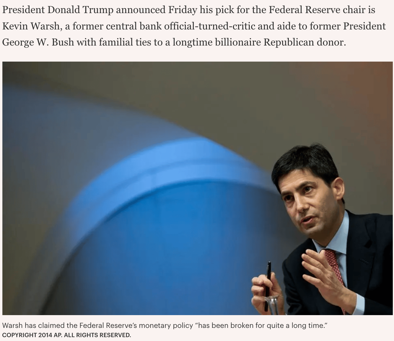 Bush nominated Warsh to serve on the Federal Reserve’s Board of Governors in 2006, with Warsh becoming the youngest person ever to join the central bank at 35.