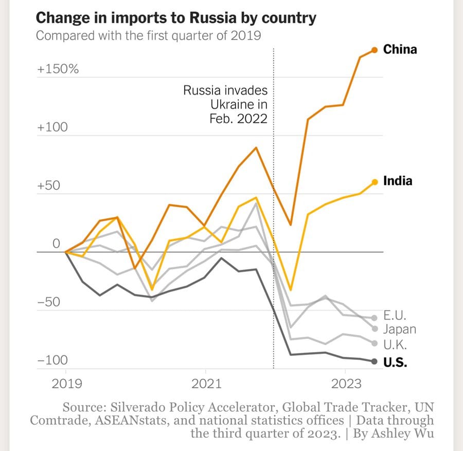 A few weeks ago we showed a chart that the US is now importing more from Mexico than China. This may be one of the reasons why: as a result of Ukraine-related sanctions, China’s exports to Russia are up 150%.
