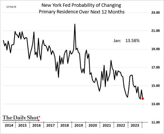 High interest rates and mortgage rate lock-ins have pushed the probability of changing primary residence has fallen to its lowest level in 3 years.