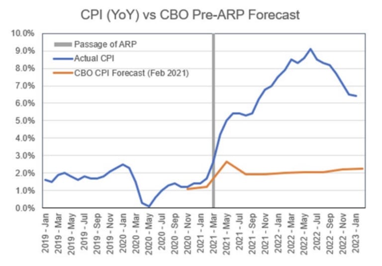 Just a reminder, no one is very good at forecasting inflation: here’s the CBO’s forecast of inflation (2%) before the passage of the American Recovery Plan, and actual inflation, which peaked at 9%.