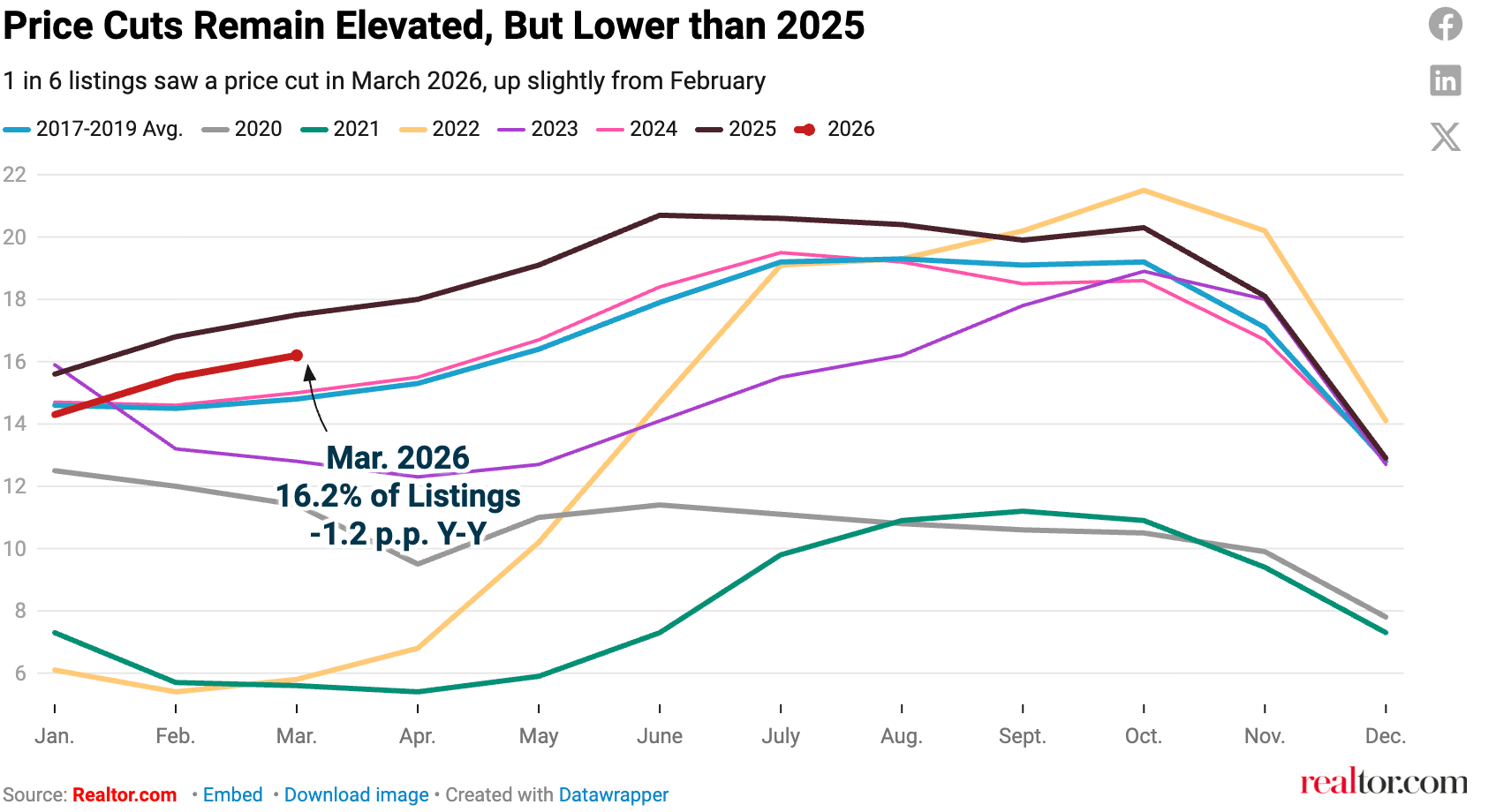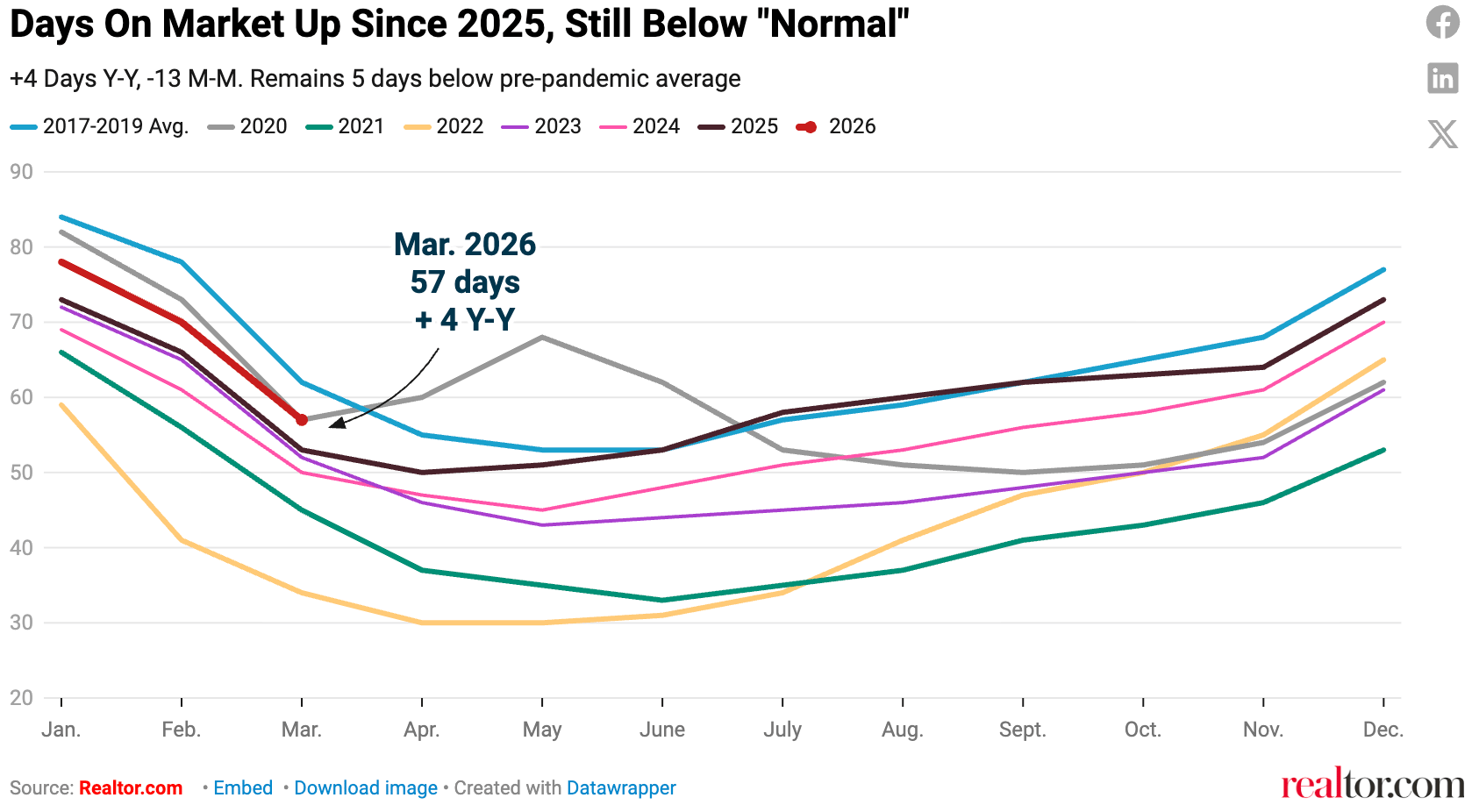 This marks the 24th straight month of homes taking longer to sell on a year-over-year basis. The median home has spent 5 fewer days on market than the pre-pandemic norm
