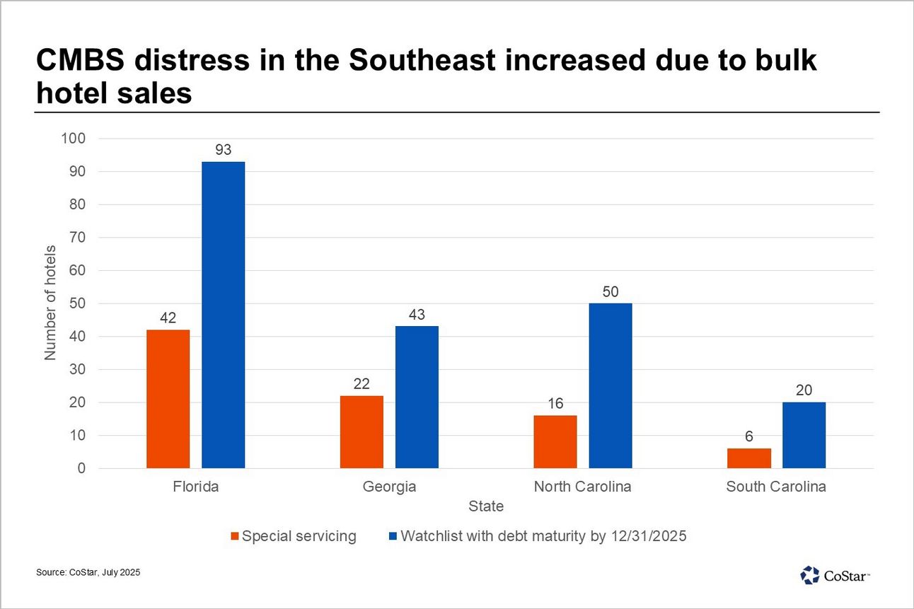 The Southeast region contains over 200 hotels on the CMBS watchlist with debt maturity by December 2025, including 93 in Florida, 43 in Georgia, 50 in North Carolina and 20 in South Carolina.