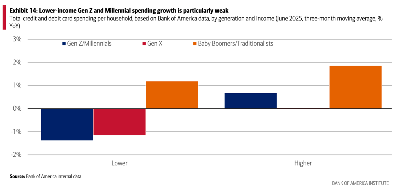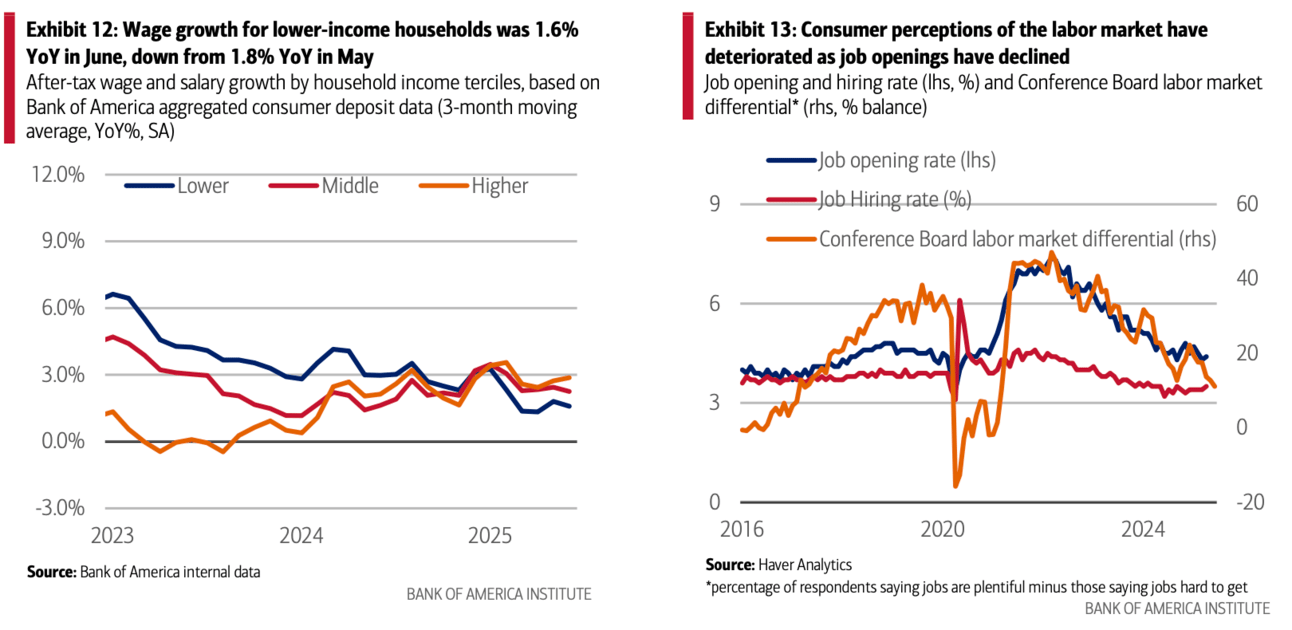 Lower-income households' spending growth is particularly soft, with their total card spending growth negative YoY in the three- months to June; these households also have the weakest after-tax wage growth in Bank of America deposit data. But the spending and wage growth of higher-income households appears to have risen