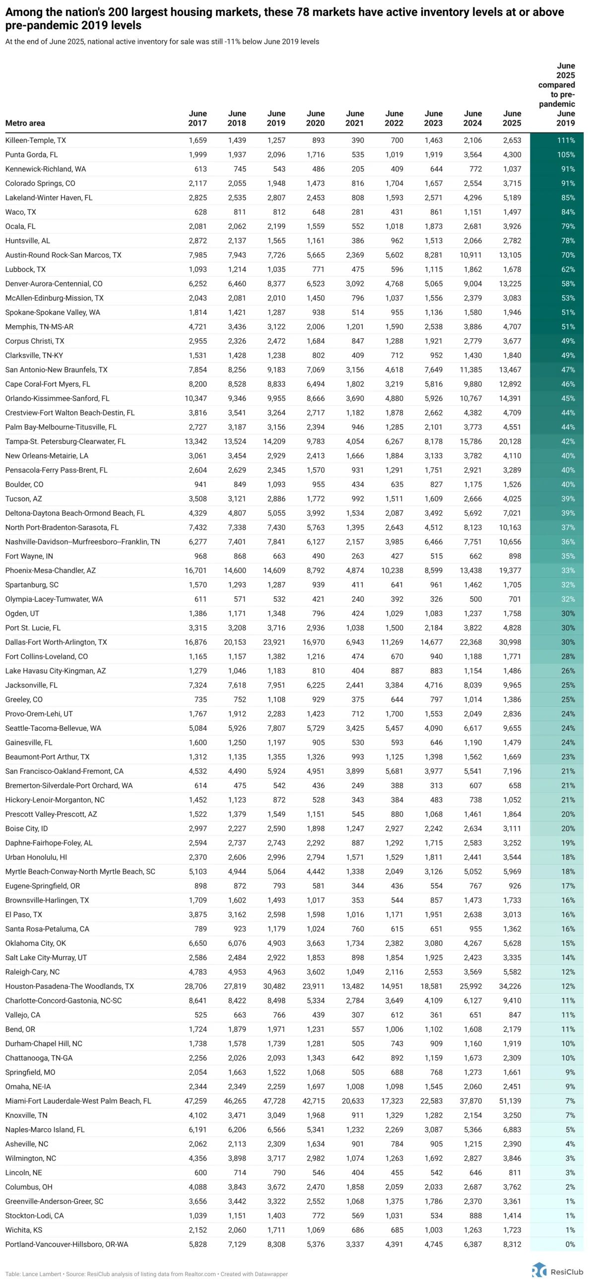 Now, at the latest reading for the end of June 2025, 78 of the 200 markets are above pre-pandemic 2019 inventory levels and ResiClub expects that count will continue to rise this year.
