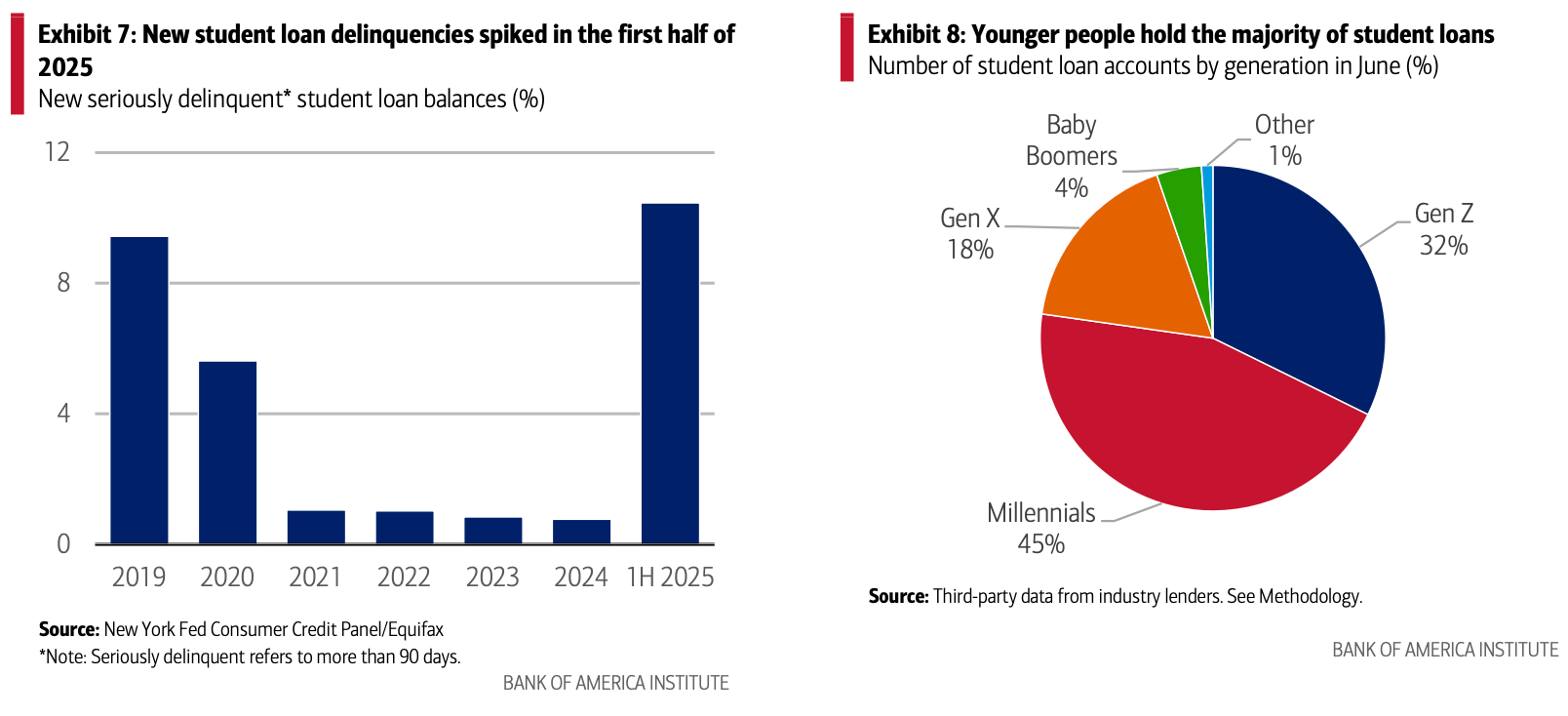 Although Gen Z and Millennials make up more than three-quarters of student loan holders, the majority of those student loan holders who became seriously delinquent, or 90 or more days past due, in Q2 2025 were age 50+, according to the New York Fed. This could put additional pressure on card spending, especially among Gen Xers, whose overall spending growth has been weaker than Baby Boomers and Traditionalists