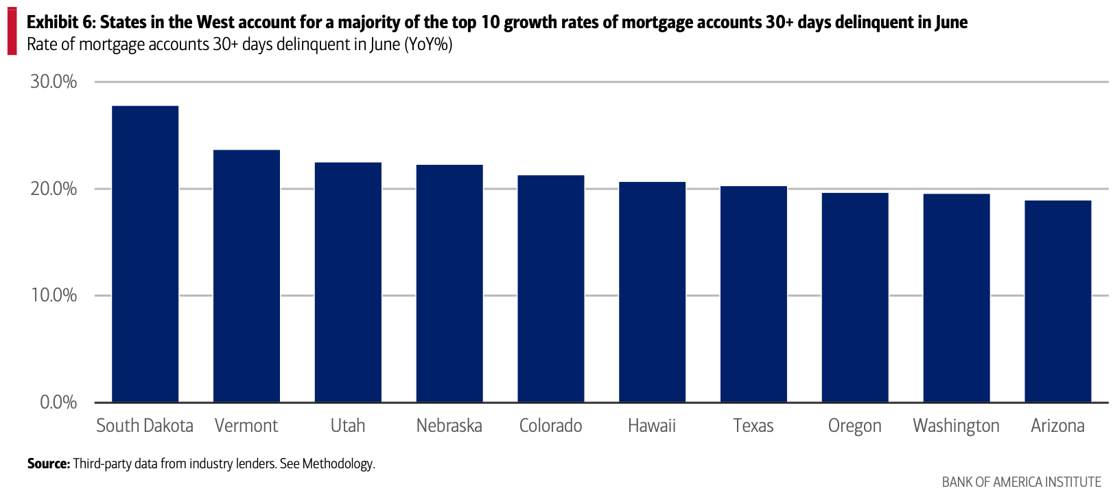 According to third-party data on industry loan account trends, the rate of mortgages 60-149 days past due was up 21.3% YoY in June, having come down significantly from September 2024’s peak of more than 33% YoY.