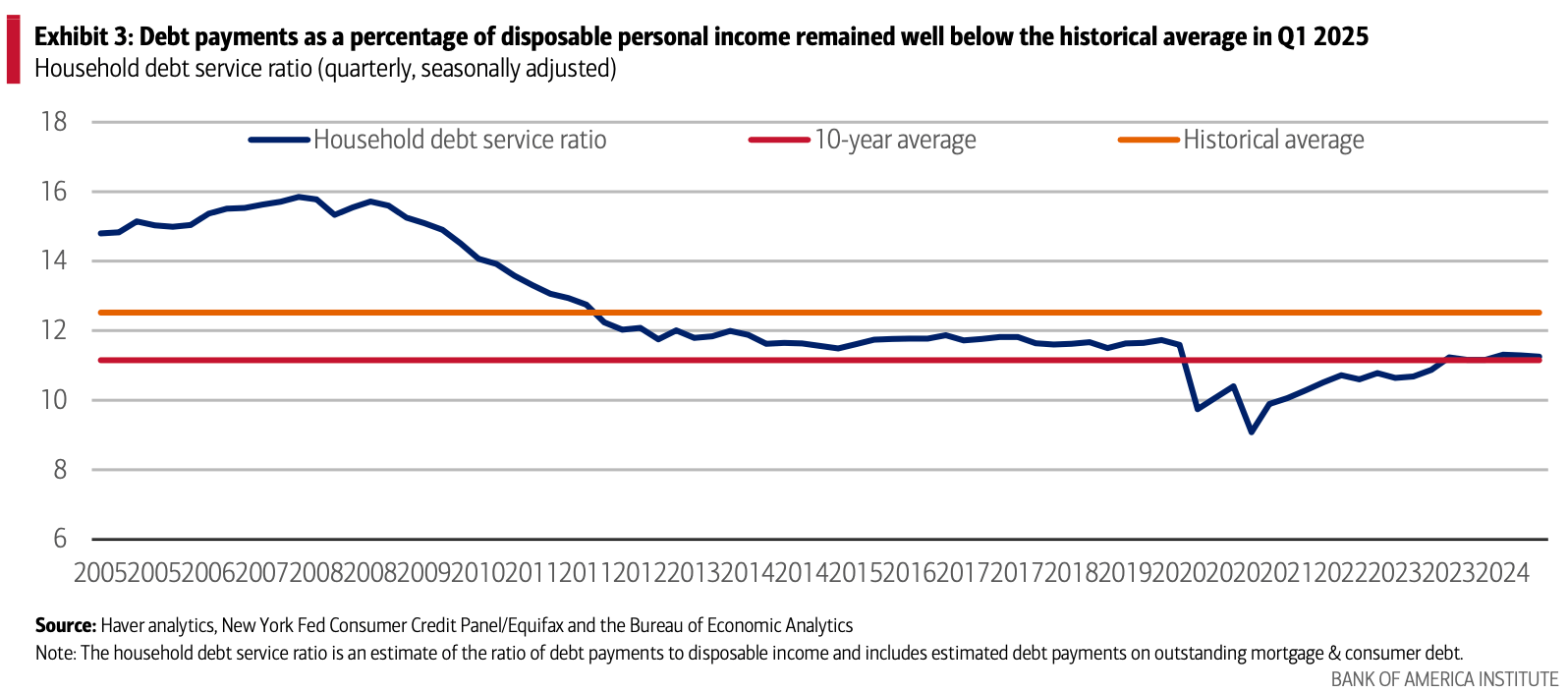 The good news is the ratio of household debt payments to disposable personal income dropped to 11.25 in Q1 2025 from 11.29 in Q4 2024 and remains below the historical average of 12.52, suggesting to us there is some room for consumers to increase borrowing, so long as the labor market holds up. Plus, household debt to GDP has been steadily declining in recent years, meaning the debt service ratio is increasing primarily due to the rise in interest rates, according to BofA Global Research