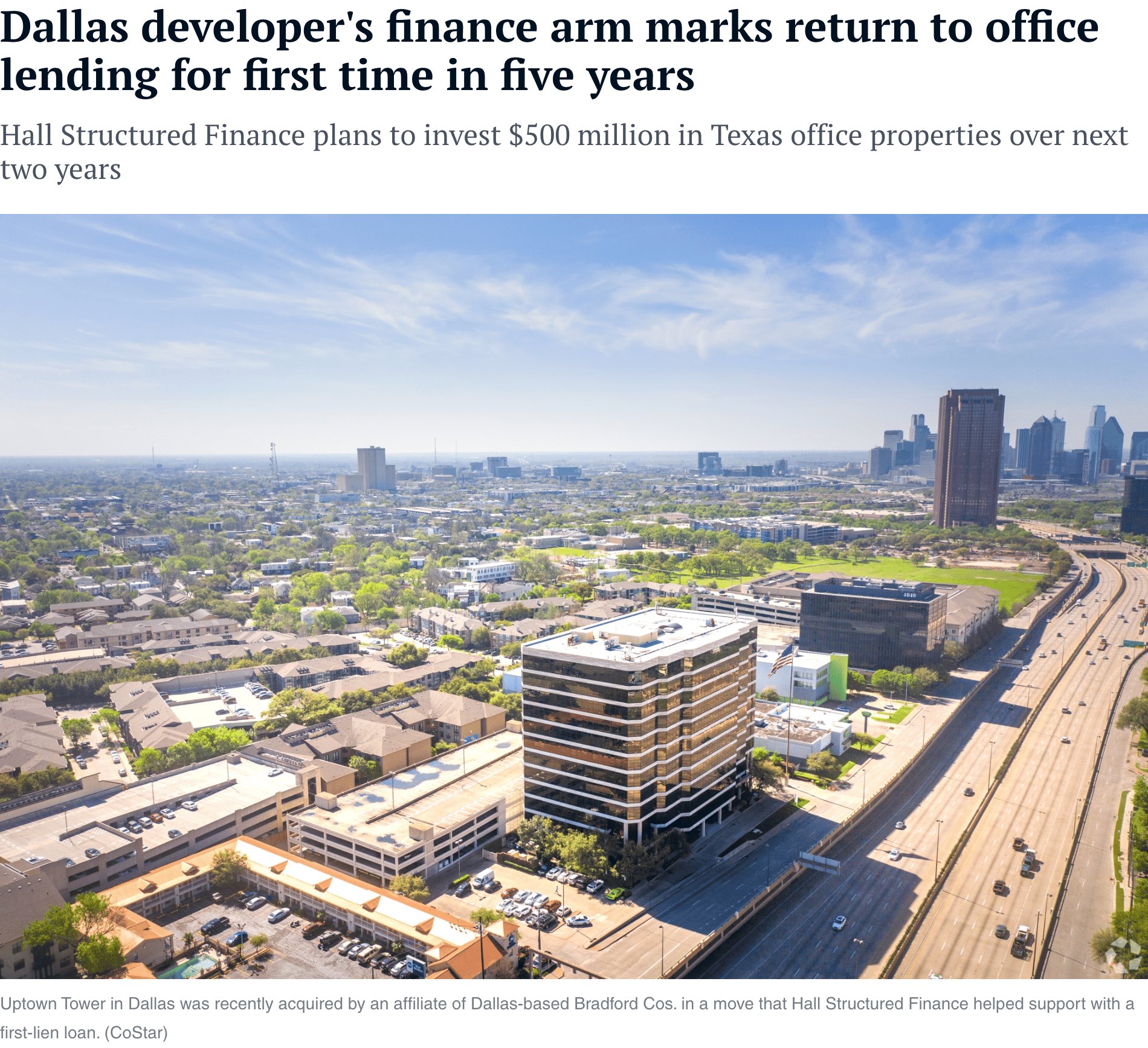 Hall's finance arm, Hall Structured Finance, made a first-lien loan for $30.8 million to an affiliate of Dallas-based Bradford Cos. that recently acquired Uptown Tower, a 12-story, nearly 254,000-square-foot office building at 4144 N. Central Expressway in Dallas. In recent years, Hall Structured Finance has backed apartment and hotel properties, but now office is part of its business with the 1980s-vintage property being the first of many more office investments planned by the firm.