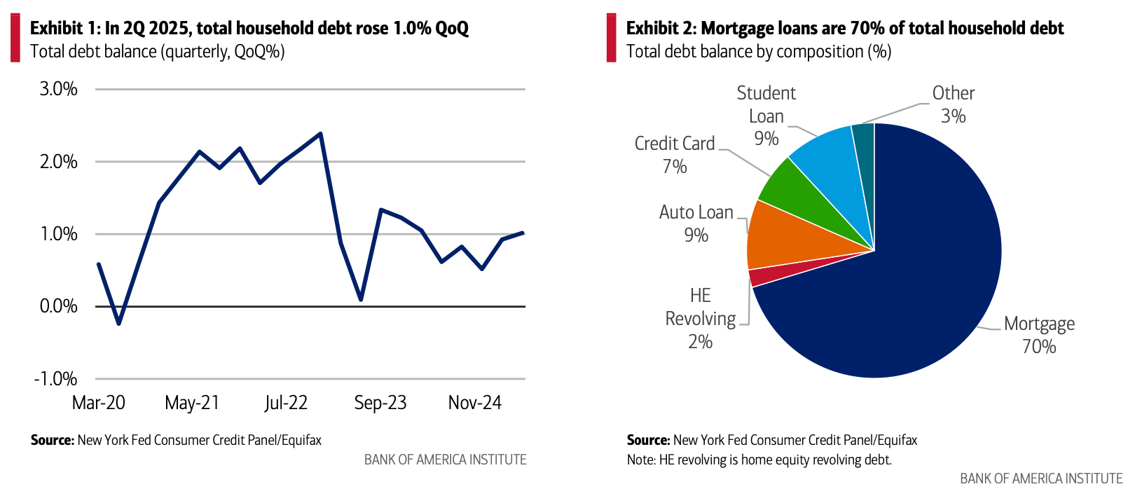Americans are inching further into debt, with debt levels up 1.0% quarter-over-quarter (QoQ) in 2Q 2025. Total household debt increased by $185 billion to hit $18.39 trillion in the second quarter, according to the latest New York Fed Quarterly Report on Household Debt and Credit.