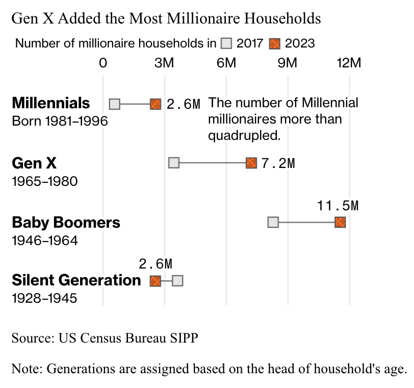 There's a wide discrepancy between the number of millionaires in each generation and the division of their wealth. Only the number of millionaires born before 1946 has declined as the Silent Generation passes away. Meanwhile, older Americans have had more time to build up 401(k) or IRA nest eggs, which they generally can tap freely starting six months before their 60th birthday. Millennial millionaires have only about 27% of their wealth in retirement accounts, Bloomberg’s analysis shows, compared to 37% for Baby Boomer millionaires.