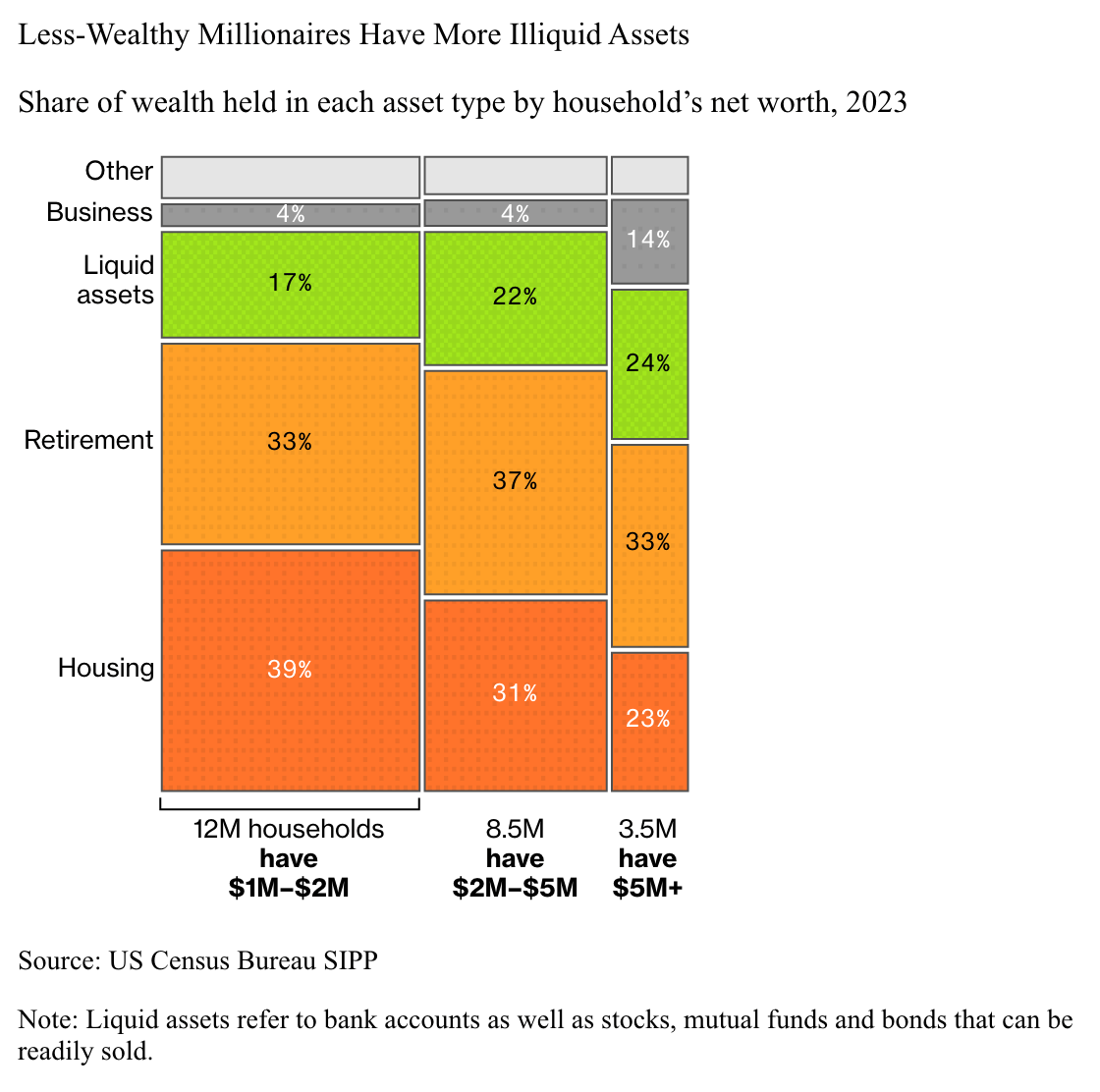 For the barely-millionaires, households with a net worth between $1 million and $2 million, the vast majority of that wealth is illiquid. They typically had 66% of their wealth tied up in a primary home and retirement accounts in 2023, an increase of eight percentage points since 2017. To spend freely, millionaires typically need to be a lot richer. Households with $5 million or more had about 24% in easier-to-access bank or brokerage accounts in 2023, compared to 17% for those closer to the $1 million mark.