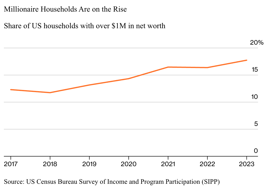 Today the number of millionaire households is more than 24 million, or almost one in five US households, according to a Bloomberg analysis of government survey data through 2023. Fully a third of those modern millionaires have been minted since 2017, as home values and the stock market surged. That doesn’t mean they’re walking around flush with cash.