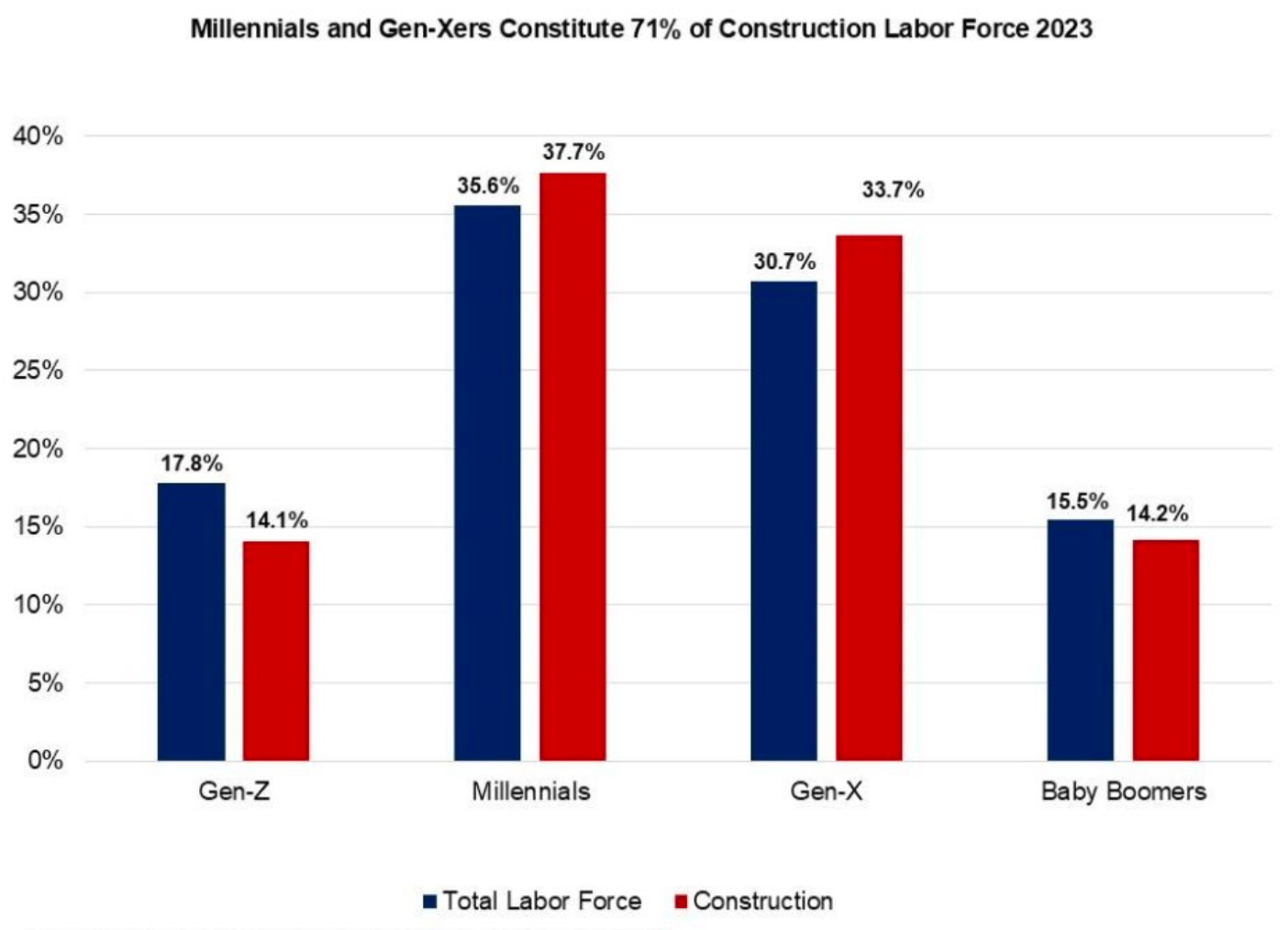 The percentage of Gen Z (those born between 1997 and 2012) individuals participating in the construction labor workforce has more than doubled, increasing from 6.4% in 2019 to 14.1% in 2023.