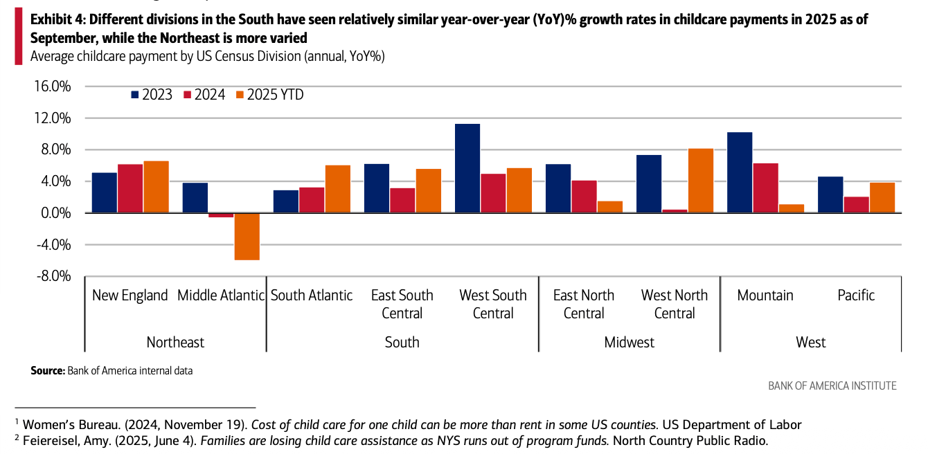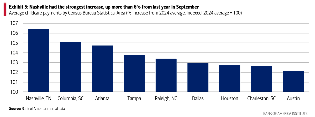 Regional disparities in childcare costs are widening. While the national average monthly childcare payment rose, some areas saw sharper increases - New England was up 6.6% and the West North Central division surged 8.2% YoY as of September. In the South, Nashville led major cities with a more than 6% increase from 2024 averages.
