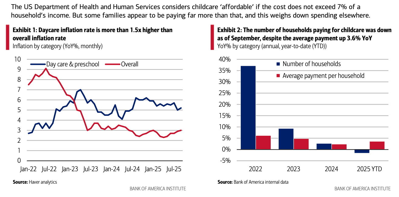 US childcare costs are rising 1.5 times faster than overall inflation, up 5.2% year-over-year (YoY) in September. This could be why the number of households making monthly childcare payments has declined, with the year-over-year percent increase in the number of households paying for child care down 1.6% YoY September, despite the average monthly payment up 3.6% YoY, according to Bank of America payments data.