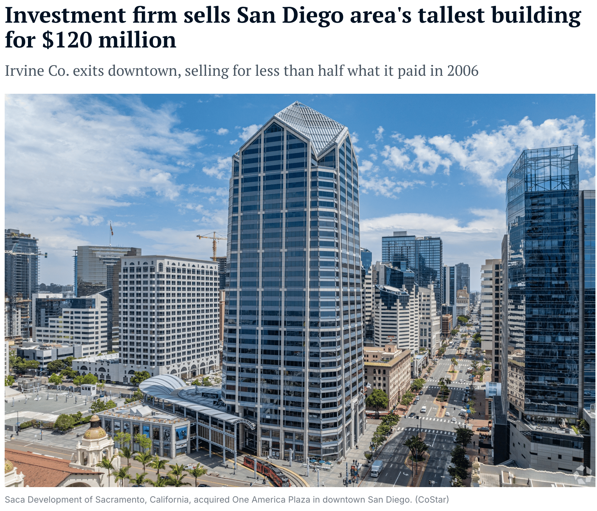 Irvine Co. sold One America Plaza, San Diego’s tallest skyscraper, in a $120 million deal marking its sixth office tower sale of the past year and its exit from the struggling downtown market at a 60% discount to what they paid for it in 2006- ~300M