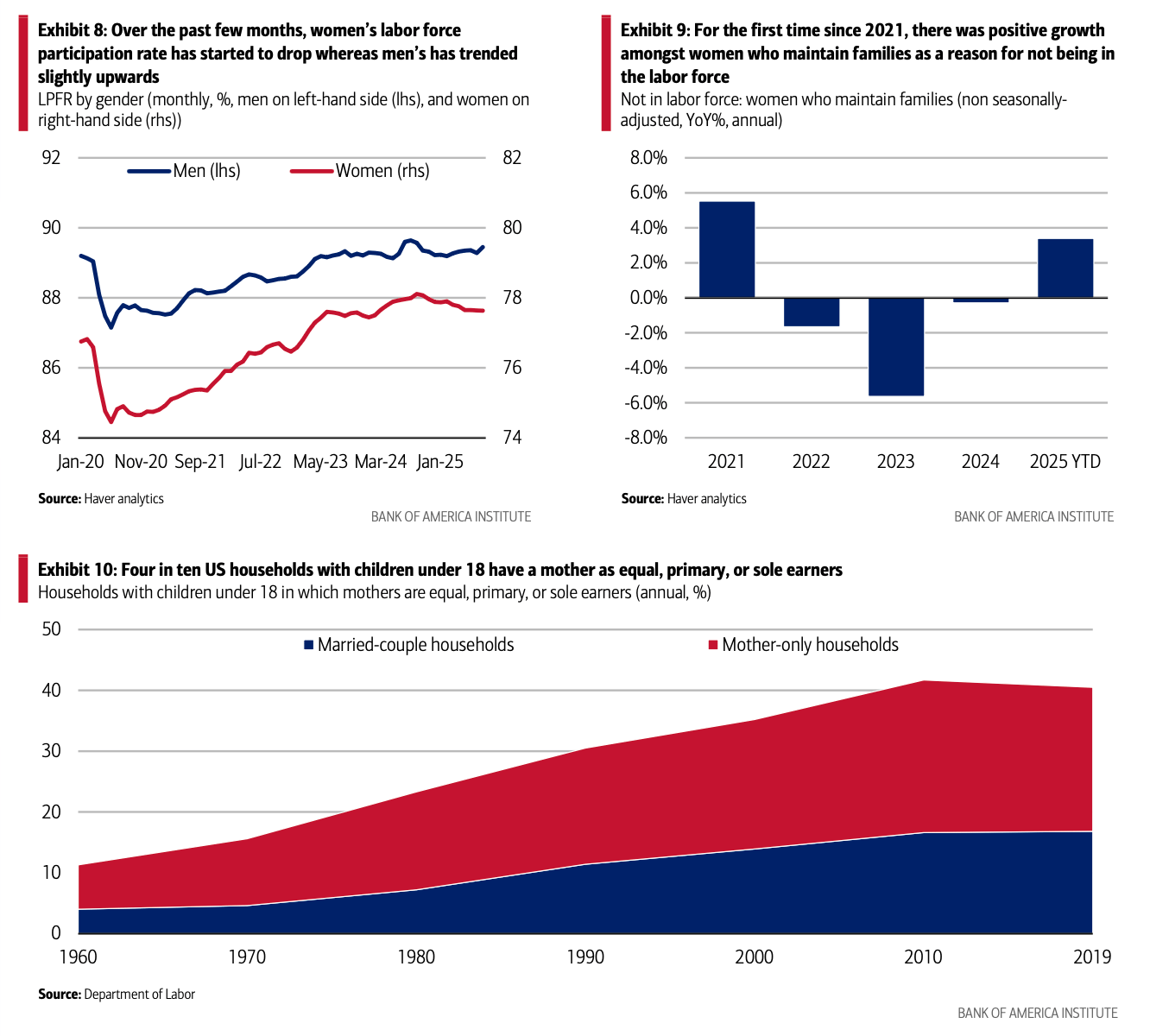 These spiraling costs mean some parents, especially women, are quitting work or cutting their hours to become caregivers. Bank of America data shows a drop in households receiving multiple paychecks while making childcare payments, especially among lower-income households, which suggests to us an increasing trend of some earners dropping out of the labor force to take on childcare responsibilities.