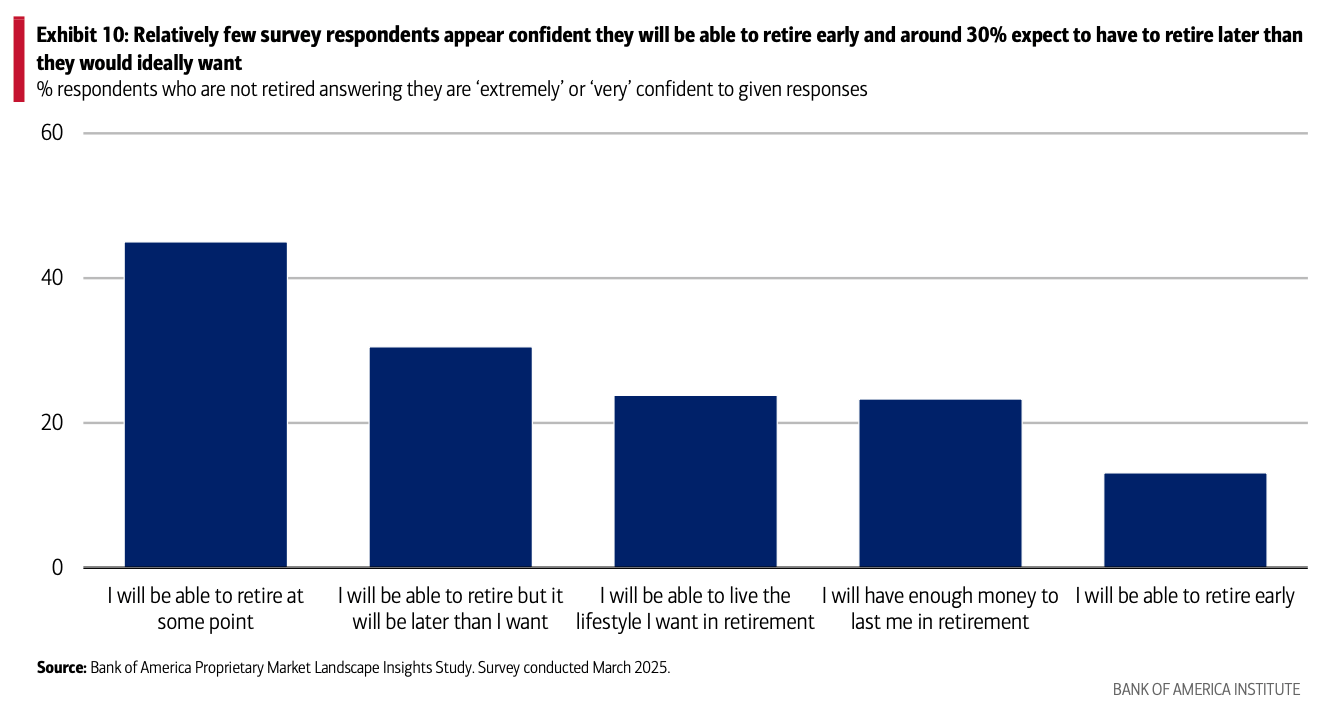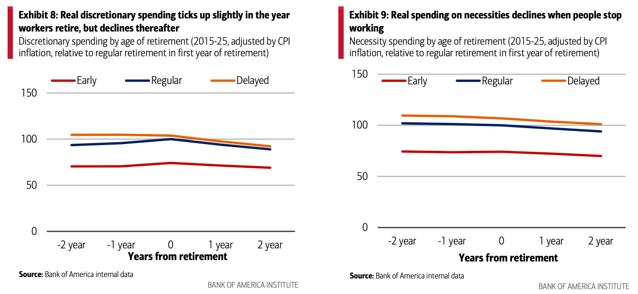 These findings suggest that as Baby Boomer and Traditionalists age, their spending will tend to decline. This implies that their strong Bank of America card spending relative to other cohorts may gradually slow, unless broader “macro factors, ” such as wealth effects can offset the trend. In our view, the possibility of lower total and discretionary spending and reduced savings in retirement is becoming a key reason why those of retirement age may keep working. According to a Bank of America Proprietary Market Landscape Insights Study, only around 10% of pre-retirement respondents felt confident they would be able to retire early. And around 30% thought they would need to retire later than they would like