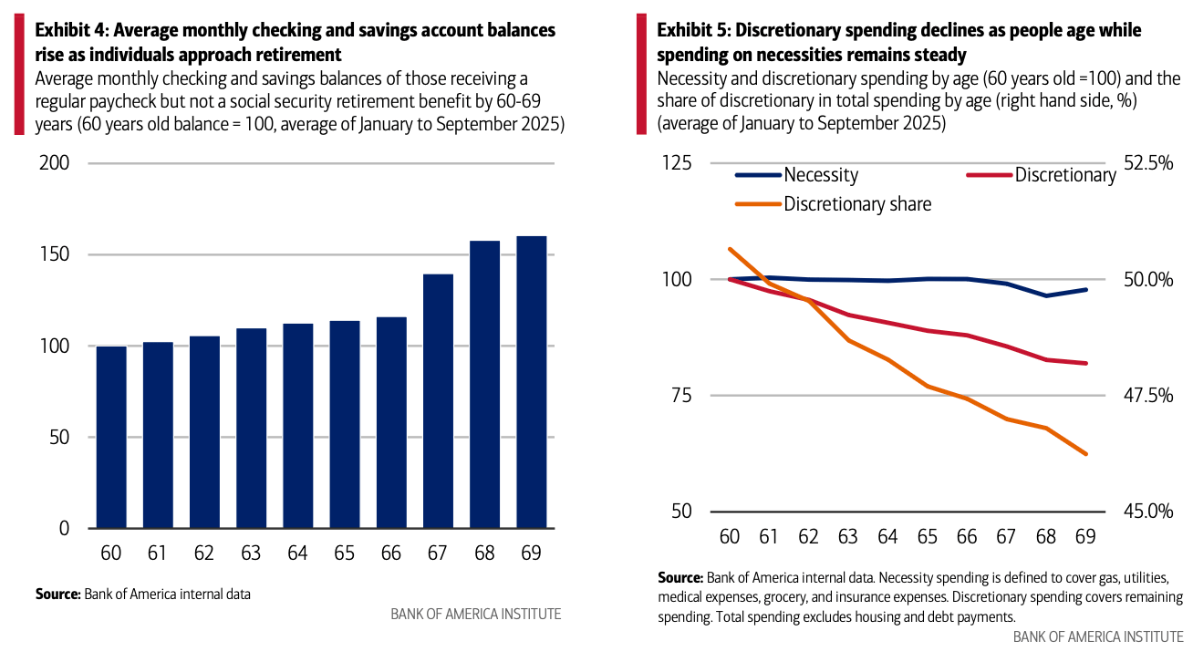 Older generations - Baby Boomers and Traditionalists - have shown faster credit and debit card spending growth per household than overall households since 2022, according to Bank of America aggregated card data.