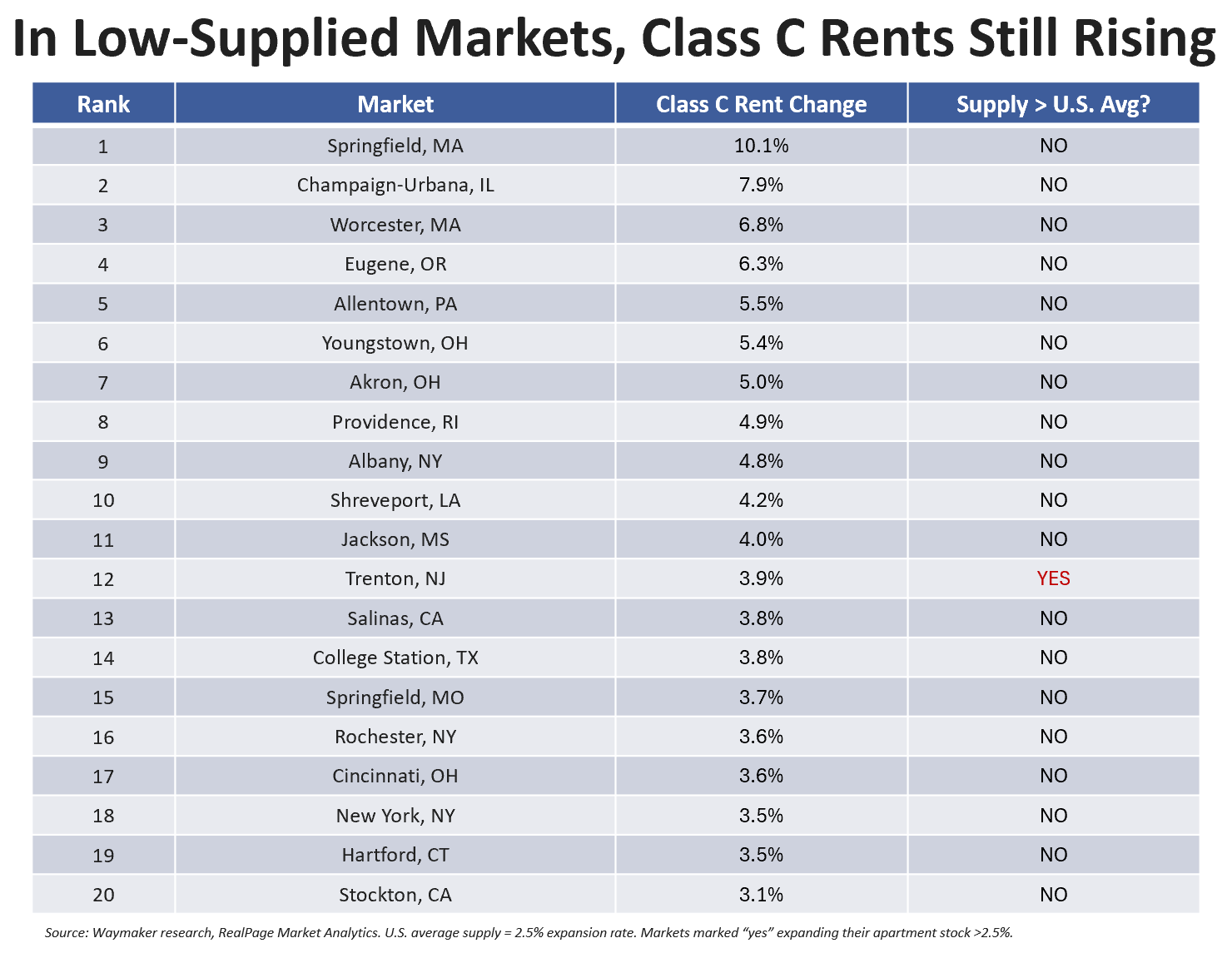 In 19 of the 20 MSAs where Class C rents growing >3%, new apartment supply TRAILS the U.S. average.